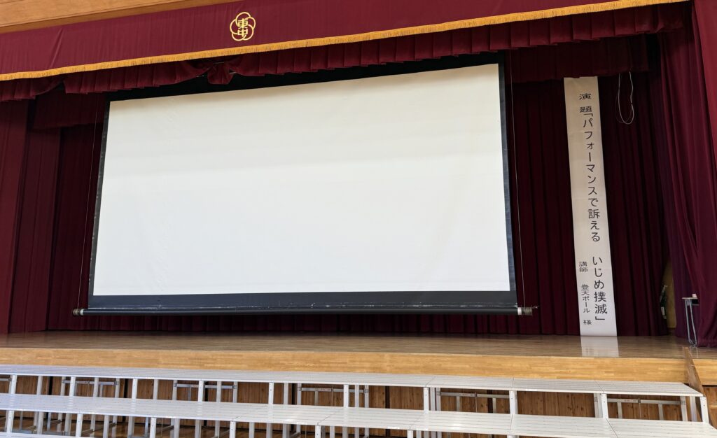 全国行脚の写真やいじめられっ子の想いを歌や語りで伝え、いじめを見たら、周りの先生や親に伝え、大丈夫か?と声をかけたりしてねと、一歩行動する勇気を伝えました。