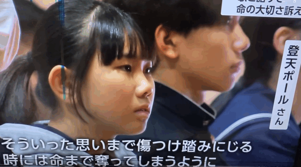 「いじめは命を傷つけてしまう。時には命を奪ってしまう。みんなの命は誰も代わることのできないたった一つの命。みんなで大切にし合って、助け合って、命を守っていこう。」